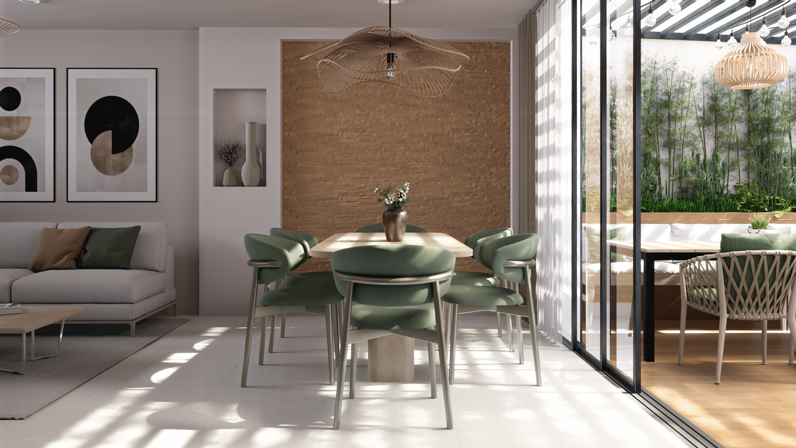 Casa de dos plantas con cocina abierta con barra conectada al comedor, salón y con salida a la terraza. Numerosos dormitorios y salas privadas para el descanso y el confort.